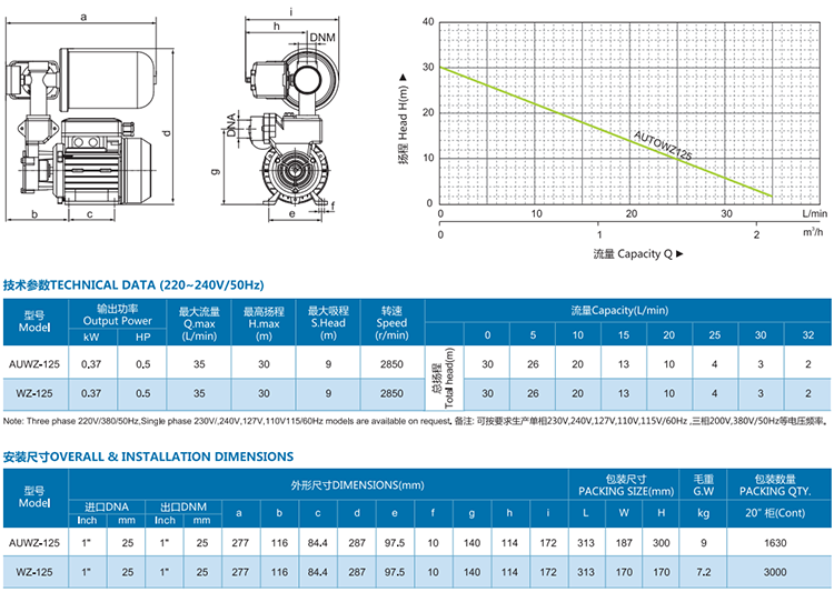 Single phase 230v,240v,127v,110v,115v/60hz models are available on request.